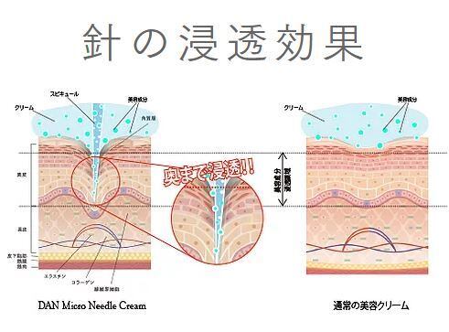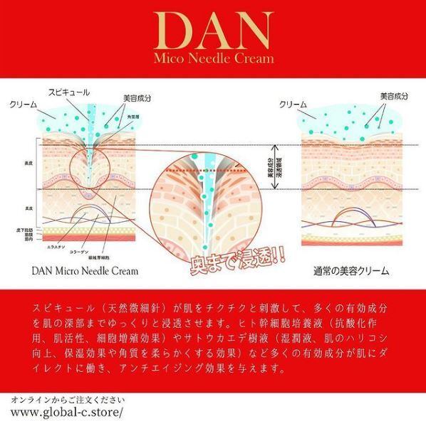 ヒト幹細胞以外の成分にもスクワランやサトウカエデ樹液(メープルウォーター)ヨモギ葉エキス、プラセンタエキス、ヒアルロン酸ヒドロキシプロピルトリモニウムなど、肌のために有効な成分がふんだんに含まれております。DANが誇る針コスメの最高傑作。高純度の針(スピキュール)による肌深部へのクリームの有用成分の浸透は従来のコスメとは作用機序が異なります。長時間、肌の角質層まで有用成分を伝えた後、体外へ排出されるので体に優しく、安心してご使用になれます。