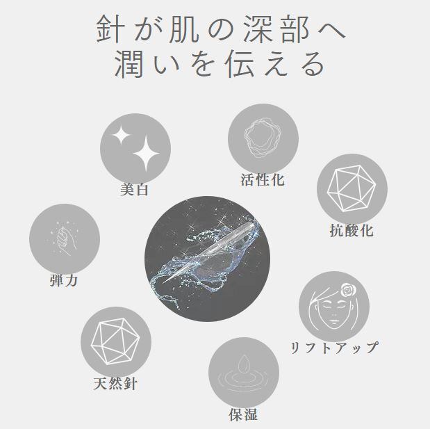 スピキュール(天然微細針)が肌をチクチクと刺激して、多くの有効成分を肌の深部までゆっくりと浸透させます。ヒト幹細胞培養液(抗酸化作用、肌活性、細胞増殖効果)やサトウカエデ樹液(湿潤液、肌のハリコシ向上、保湿効果や角質を柔らかくする効果)など多くの有効成分が肌にダイレクトに働き、アンチエイジング効果を与えます。